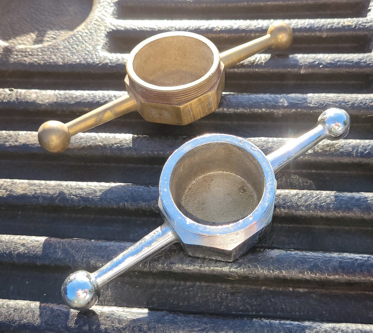 FS: Reproduction cast brass turtle deck latch escutcheons for early to mid-teens Model T Ford Roadsters. They have been counterbored for the latch lever but will still need to be sanded and polished to make them look presentable. AFAIK these are not being reproduced at this time. Asking $8 per pair,...