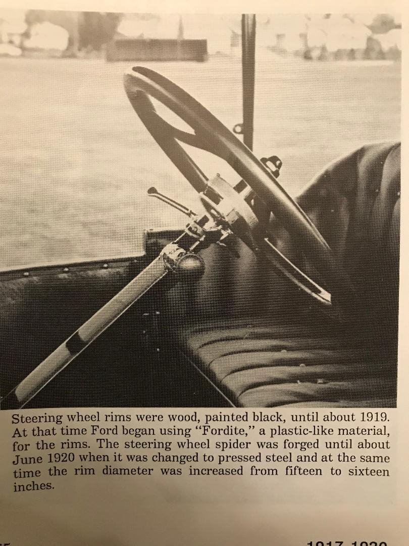 ]Hi, Newbie to posting , been lurking for years. I have a 1919 coupe and the steering wheel is Fordite and it is cracking. Been thinking about grinding out the crack and using JB weld. This is a 15 inch wheel and has T902 and FORD in block letters stamped on the backside. I would like to keep the or...
