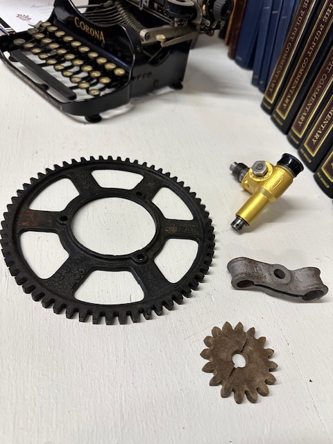 FS. Miscellaneous gas headlight parts. (sold as a lot) Includes the two burner bases pictured, one elbow, two door latches, one hinge, two igniters, 13 burners, etc.
