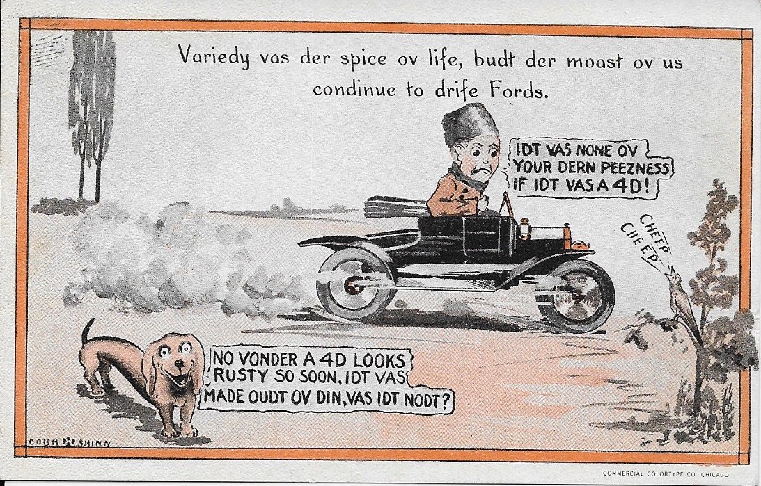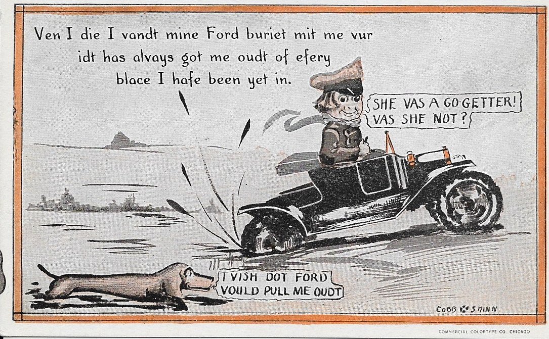 The Model Ts in the Cobb Shinn cards at least resemble Model Ts. These cards as well as the last two styles are all drawn by the artist "Witt". While there are three styles of his cards, all but one that I have that are postmarked are either 1917 or 1918, suggesting they were all drawn about the sam...