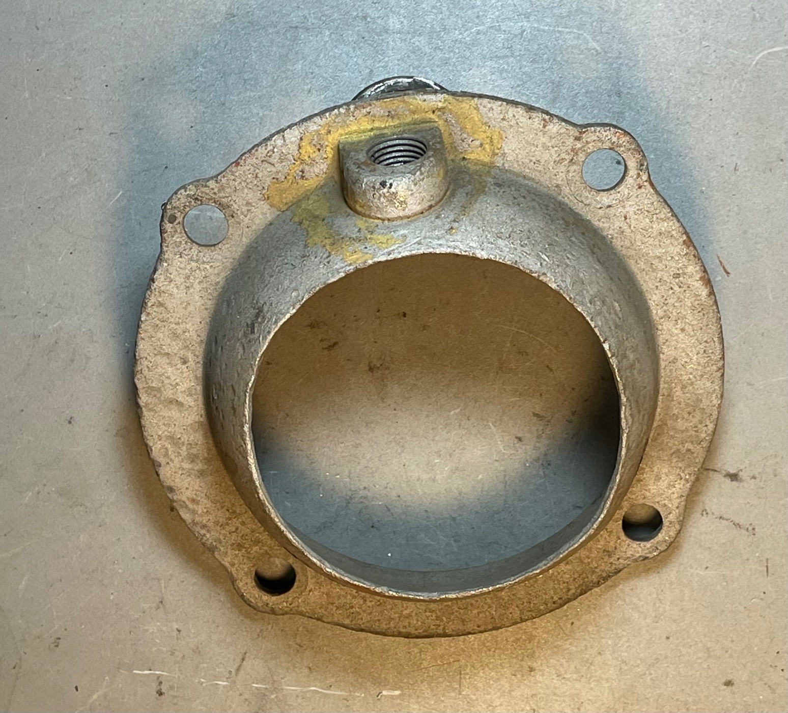 This piece is riveted to the top tank of black era radiators and protrudes through the rear wall of the tank. It is threaded for the radiator stay rod.