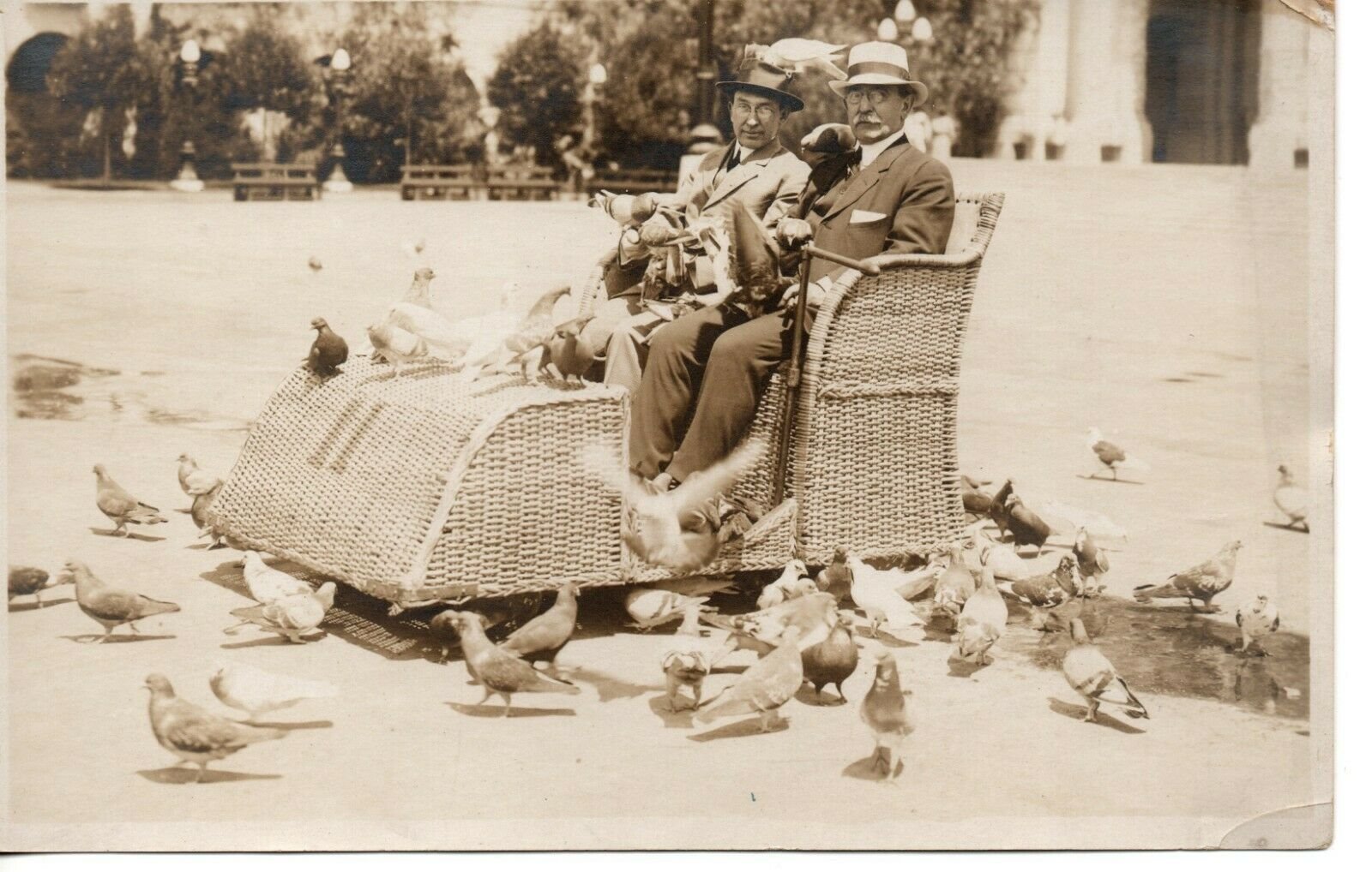 Herb, this photo is a tremendous find. Sebastian has been looking through the Institute files for years for a copy. This shows the Helgemandolar twins en route on their first and only trans-continental flight in 1900. The twin brothers, Branaman and Scrimshaw collaborated on this unique hovercraft made of wicker, and powered by a flock of pigeons, shown here, resting and feeding in a field near Chugwater before resuming the cross-country journey.