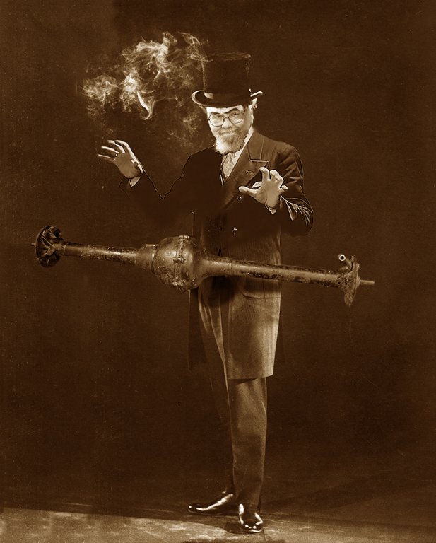 Back to the subject of clocks and such, Bartholomew discovered a file on Gaylord Rumpole (pictured) a watchmaker in Medicine Bow who supplied practically all of the time pieces used in Calhoun County in the early days. Employing a design modification discovered by KD, his movements eliminated the customary escapement/balance wheel arrangement. Free-wheeling watches and clocks recorded hours and days in just a few minutes of real time. Most historians agree this aspect of perceiving time is largely responsible for the massive industrial accomplishments and technological advancements in the basin in that era. Even in the UK, the Royal Horological Society agrees that by 1896, it was 1948 in the Tri-burgs. As the old saying goes, fiction can be stranger than truth !