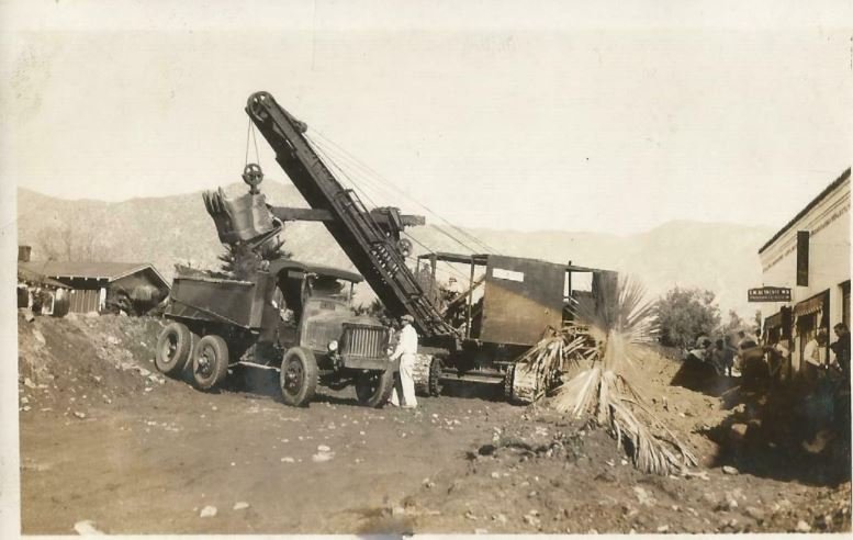 I love the old truck pictures and their settings. This truck looks to have a contractor sign on the side and in the background is a steam roller