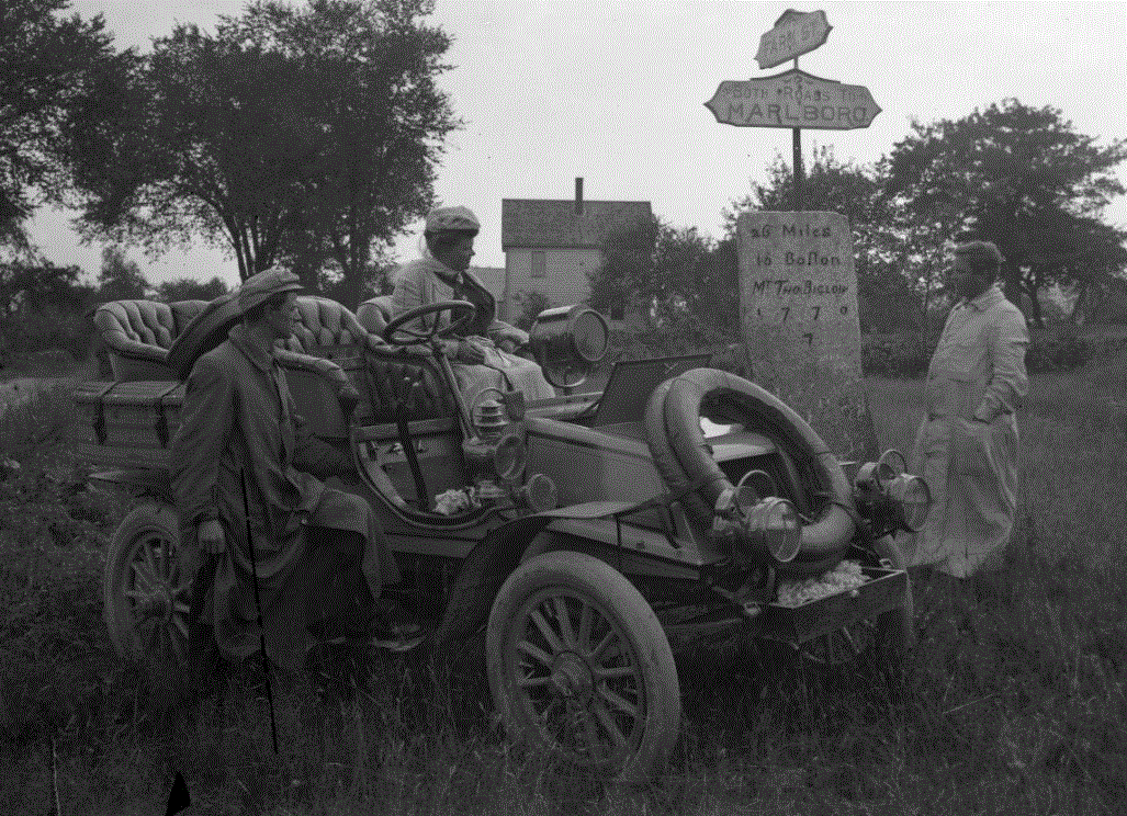 Mark, thanks for identifying the tricycle. Like Dan, I'm also really enjoying the Winton photos. What a "tell", the name "Winton" inscrbed on the tonneau handle ! :lol: Thanks for these, I do believe that's the first picture of a rear entrance tonneau Ive ever seen that gives a good feel for scale ! I have never seen one "in real life". Mighty amusing, the sign that says you can go either direction to get to Marlboro ! Kind of the antithesis of "You can't get there from here !" :lol:
