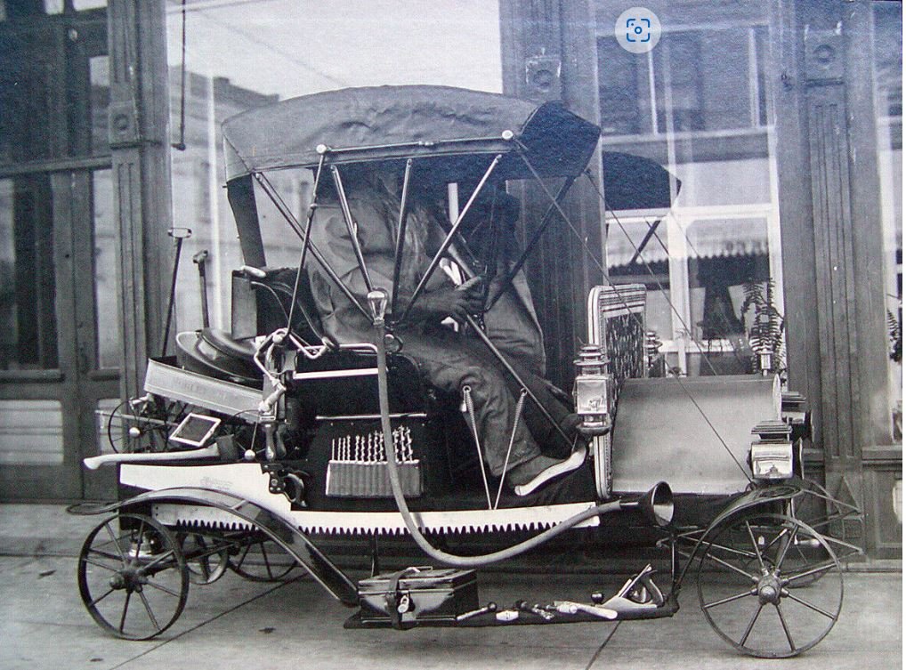 By pedaling furiously, an athletic driver could attain speeds of 15 miles per hour. Unfortunately, the poor road conditions of the day caused the machine jounce violently at speed, in consequence of which it would leave a trail of assorted tools behind it whenever it was moving at any speed greater than a walk. That caused the Bridge And Road Committee to ban it from the public ways. The machine was converted into a rolling power milking machine, and remained in that service until sometime after The War.
