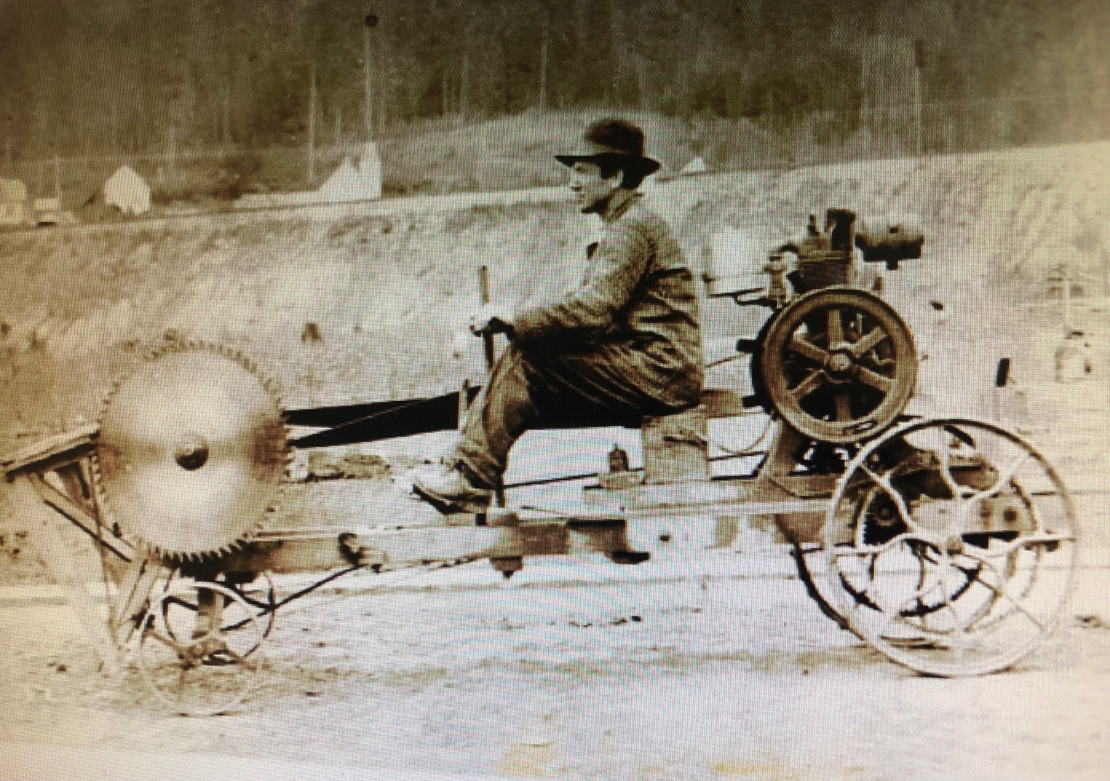 The windstorm of '19 made nearly all of the roads, trails and byways in the Basin impassable owing to the number of fallen trees. Elmer Fosdick leaped into the breach with his concept for what he called the"Velocity-Sawzallit-Motopede". KD provided engineering details, and the machine was built by the Larkvonnet Bros. Blacksmith Shop in Saddlestring. In short order, Triburg residents were once again free to travel, and enjoying an abundance of cordwood. Fosdick was something of a hazard on blind curves, however, and when the county surgeons began to report an alarming number of amputations, Elmer dismissed their concerns with the comment, "It's all idle gossip."