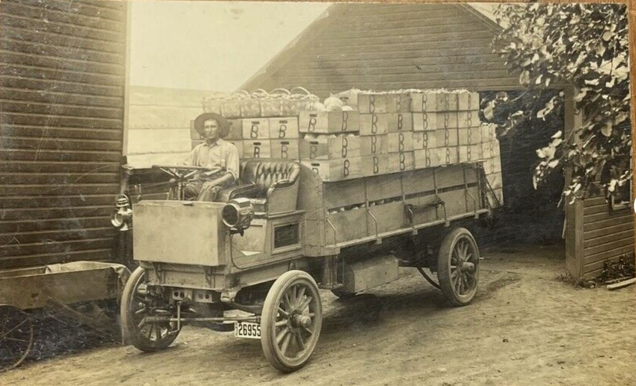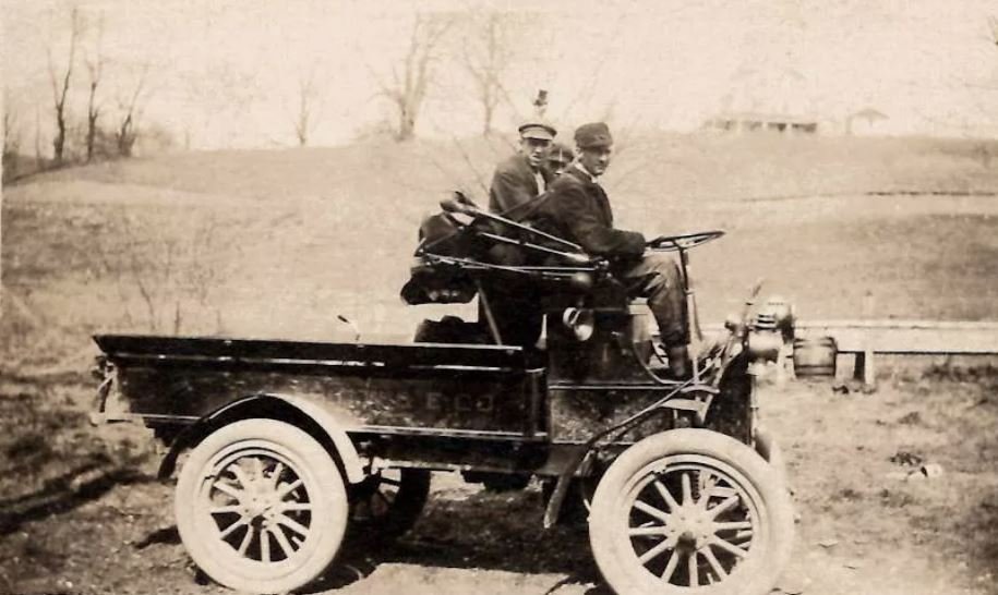 I believe an about 1906/'07 Cadillac runabout with a pickup box added onto the rear. That round thing above the hood is an acetylene gas (large) spot lamp. An after-market accessory that some people in the early days would choose over two headlamps for night driving. More common on automobiles and trucks before 1910, however, they remained available through the 1910s and were often used on fire trucks even much later. Some Mercer Raceabouts (and similar cars) had them in the mid 1910s, and a few have been restored that way.