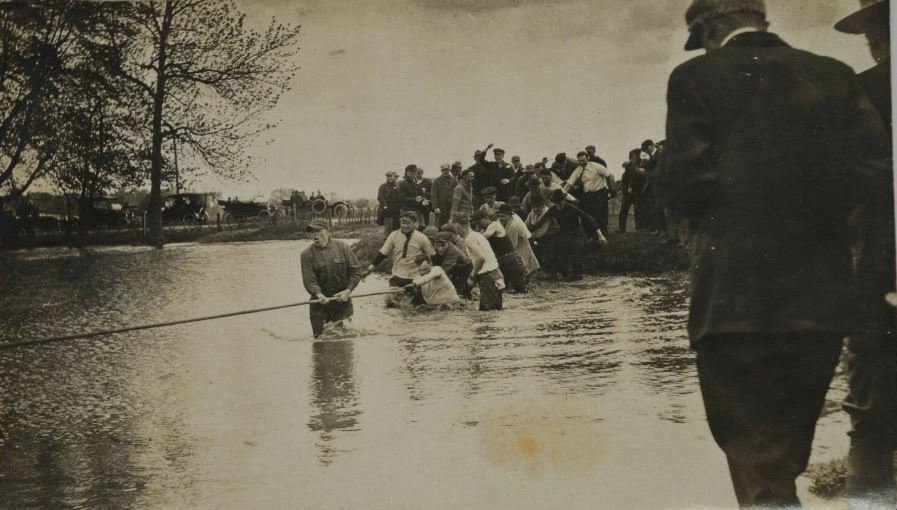 When the Model T was introduced in the fall of 1908, Tri-burg entrepreneur Amos Aloyisius Abercrombie correctly assessed the desperate need early motorists had for roadside assistance, and outfitted a wagon filled with tires, tubes and spare parts. Pulled by a team of sturdy Percherons, he was thus equipped to make emergency repairs as well as to pull hapless automobiles out of mud, sand and snow when mired down. His favorite replacement part was the band linings he fabricated from an experimental friction material KD had developed and named “kevinite” after Kevin Donnybrook (more about that later). Local wags started calling his enterprise “the band wagon” which is just as well, as it saved Abercrombie from legal hassles that definitely would have arose over the right to use “Triple A” as a trademark.