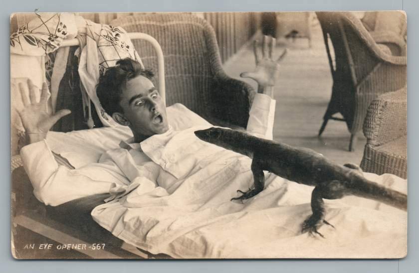 Many people do not know of Kalamity Dick’s experiments in paranormal study. For a short time, he had a device which could provide real time 3-D images of one’s dreams. The photo shows Amos Tuckett, regular bar-fly in Ernie’s Saloon, and Medicine Bow’s official town drunk, who volunteered for Kalamity’s first experiment with the “dreamulatir”. Alas for poor Amos, he was verging on delerium tremens at the time, and the apparition of the lizard creature affected him in the worst way. KD saw the dreamulatir as a potentially hazardous influence, realizing that in so far as people were not dealing well with actual reality, they were simply not at all ready to deal with virtual reality. He scrapped the machine and burned his notes. It’s only in the last few years we see how he was proved correct in that assessment.