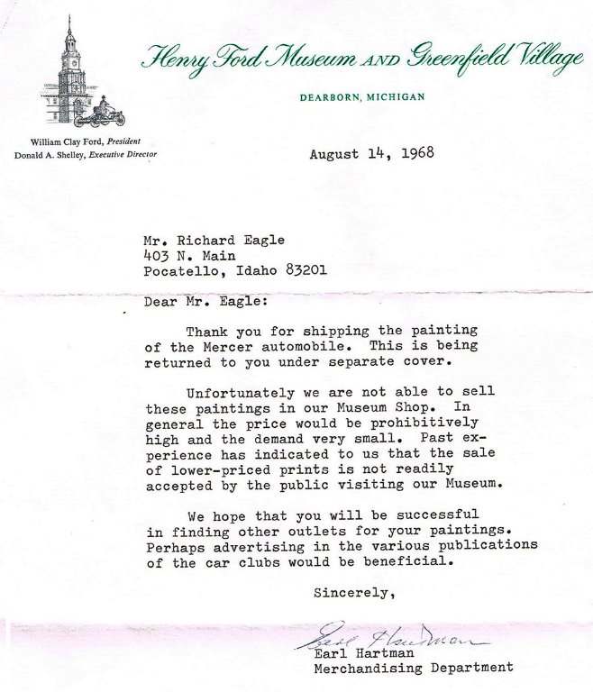 I ran across this rejection letter from the Henry Ford today. I have a similar one from Harrah's collection at the same time. I was hoping to make a living printing art from stencils I cut out. (1968) I am still pleased that I made the effort to try to sell them. Other attempts to sell car art made it clear that the general public, then and now, have not overwhelmingly purchased paintings of cars. In the '60s and '70s calendars with antique car photographs were popular items at Christmas. I can't find them in the stores these days. Napa and others gave them to customers for a time. I sold calendars with my paintings for a few years and didn't recover the cost of printing or postage, but I met a lot of nice people. It was worth it for that.