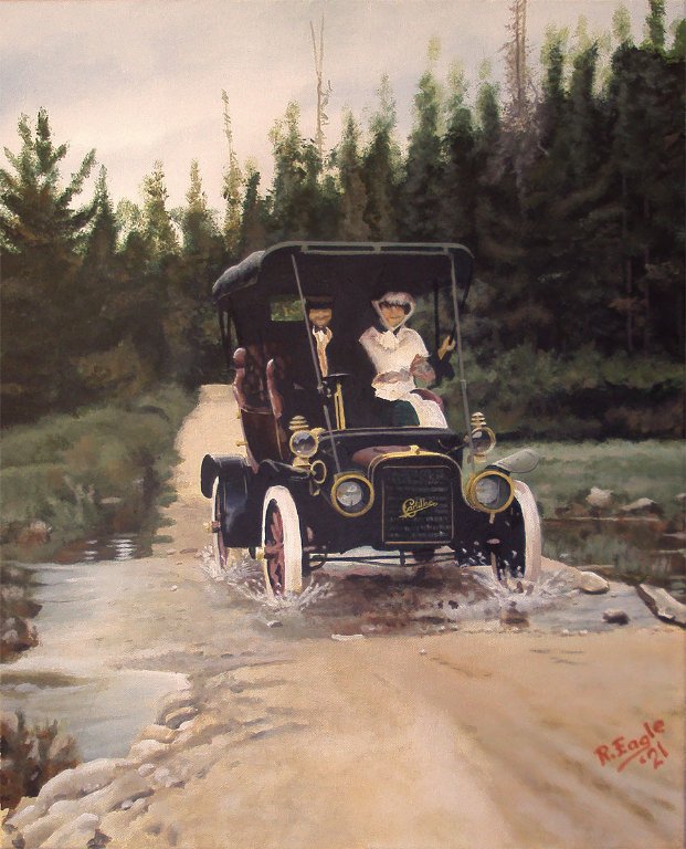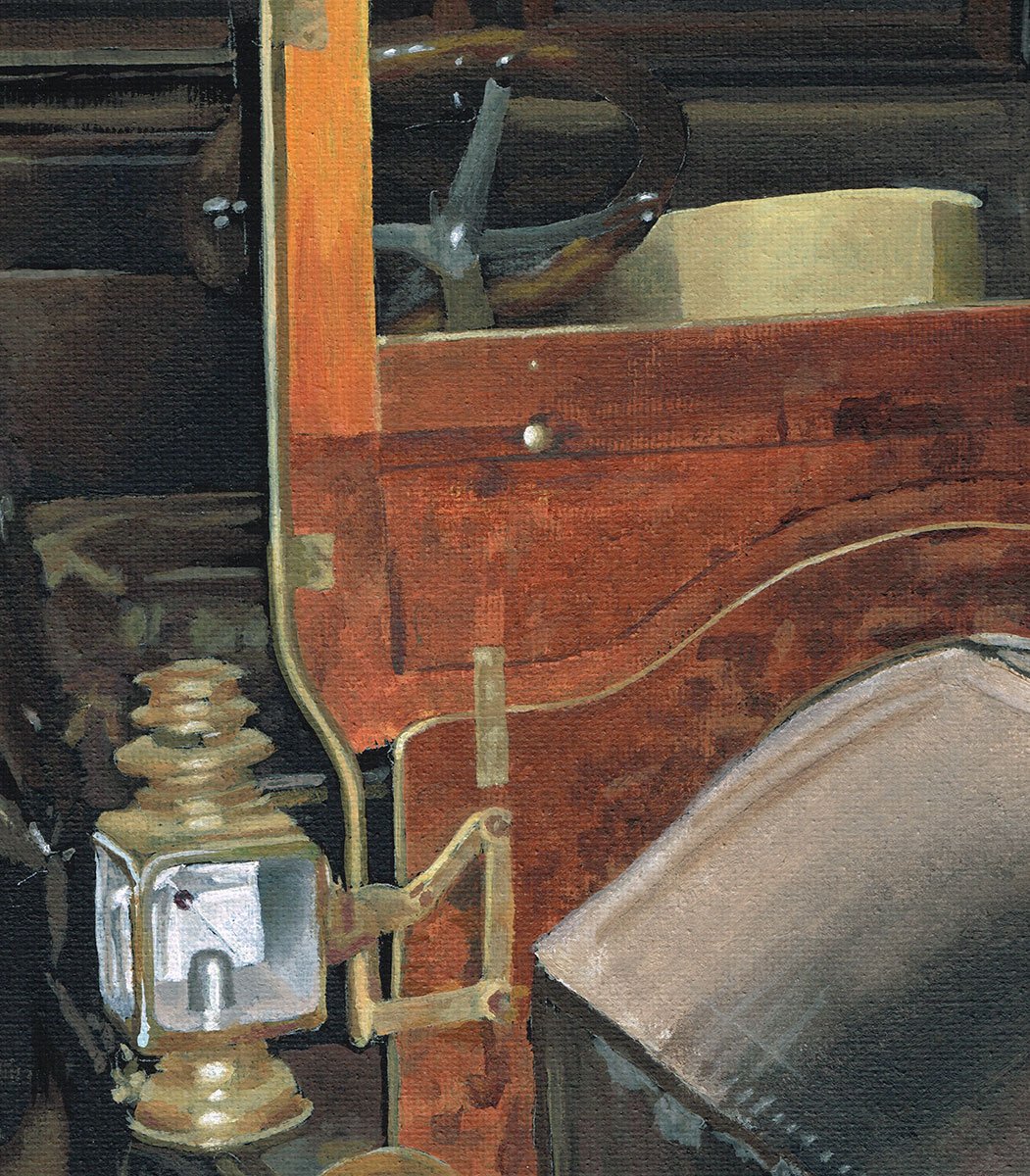 I painted this based on a 1904 Model AC Ford that was for sale on the Bonham's site. I studied many photos to see how the door would look opened. The buggy step to allow one to climb up and into one seems wonderous.