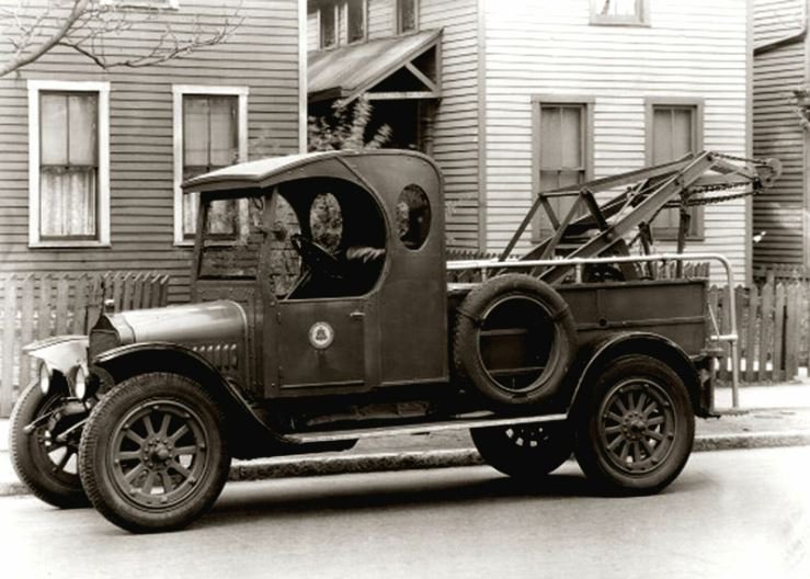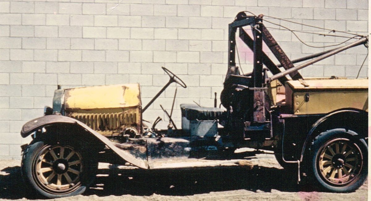 I see a caption: "1931 Indiana Bell Telephone Company tow truck (Bass Photo Company Collection, INDIANA HISTORICAL SOCIETY)" for one source. A large fleet of vehicles may have justified their own wrecker. It is a White with a similar chassis to the Yellowstone buses with 24" wheels and the same fenders. The typical gas lights were replaced by Model T headlights. The body work looks like around '26.