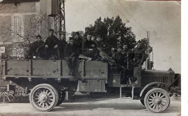 Liberty truck somewhere in France during WW1 i think, the style of the houses and the steel powerline mast are very French