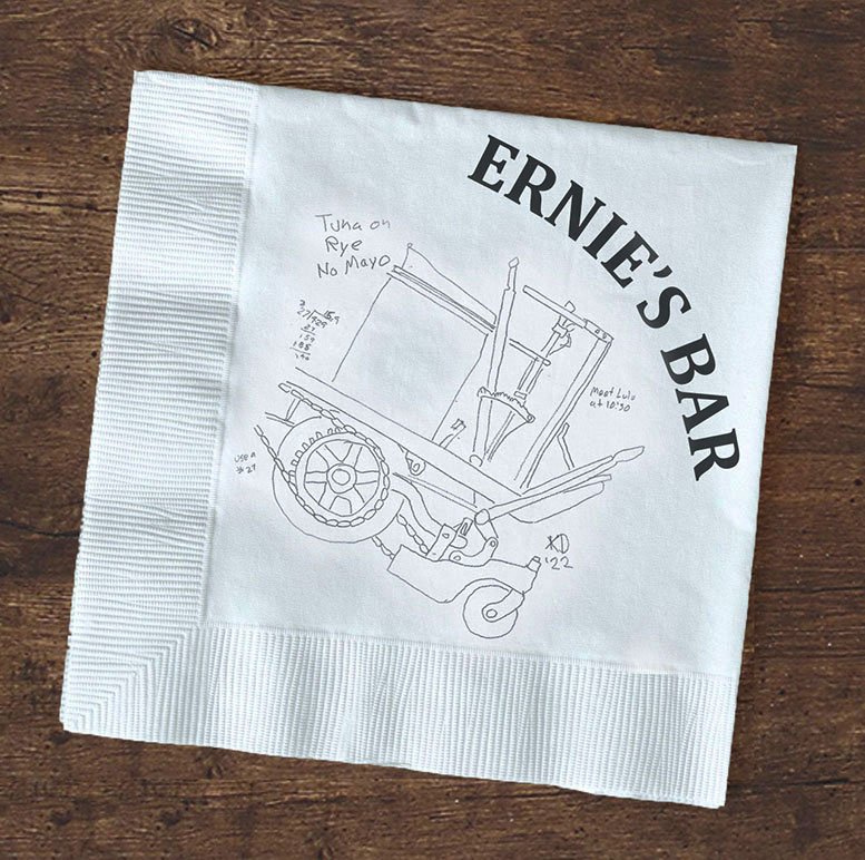 The sketches on napkins file is probably the largest single collection of documents in the archives. No doubt this is one of KD’s concept sketches for the floor sanitizer. The notation, “tuna on rye, no mayo” dates it to the first edition when KD was allergic to mayonnaise.