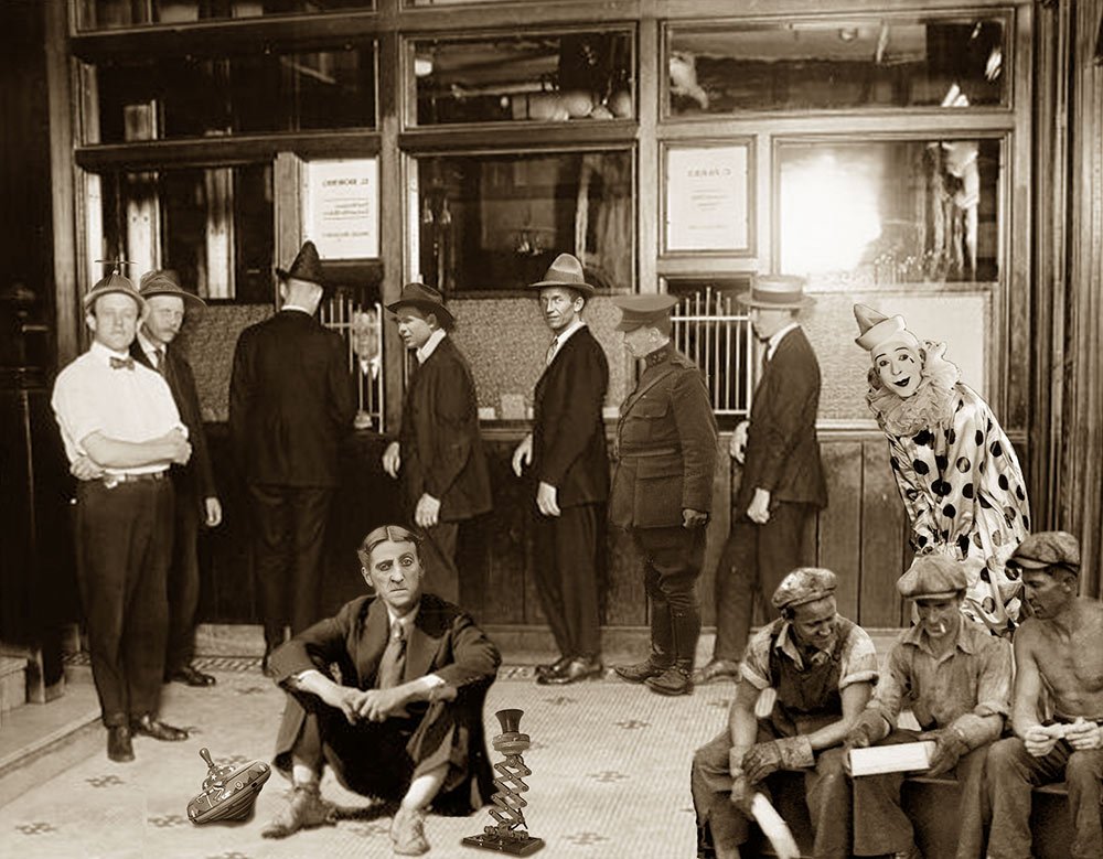 Here we see Zebulon Butchellfister patiently waiting in line at the Helix mill for tickets to the radio show. He brought his kit and caboodle as identification.