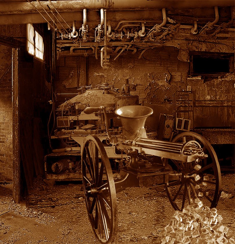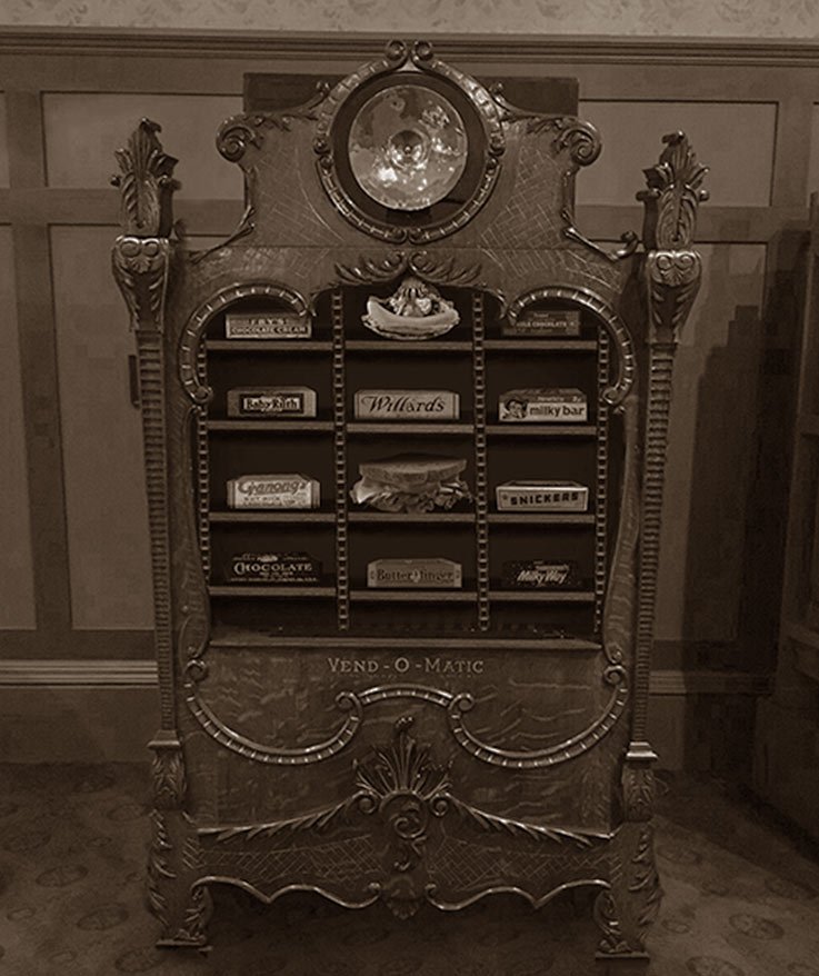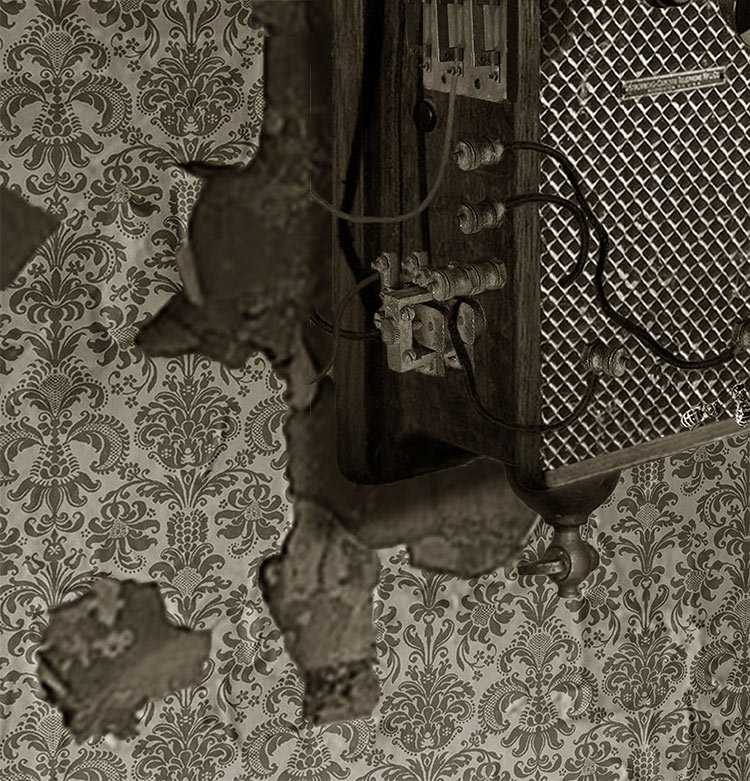 Small detail compared to the marvelous complexity of KD's engineering triumph, but the photograph beautifully displays wallpaper designed by Florabelle McGeachen, world-renowned decorative artitiste and Tri-burg native. It's rumored she and KD had a "thing" for each other, but their interactions were so discreetly conducted none could say how deeply involved they may have been. Suffice to say, after Florabelle lost her life in that tragic flour paste accident, KD never again chose to hang a wallpaper pattern she had not designed.