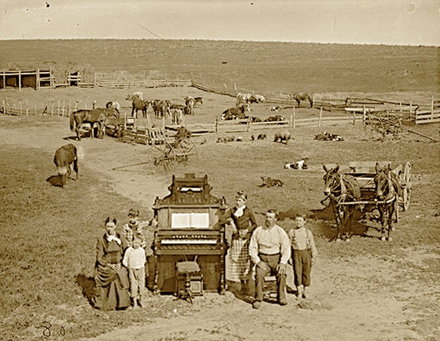 That's a wonderful view of Cuthbert Maddox's corral. KD gifted Cuthbert's hired man Spud Whiffletree with a fine pump organ on the condition that it would be kept and played near the corral, or in the horse barn during inclement weather. That's spade's wife Demelza and their kids in the photo. Demelza was an accomplished musician, and practiced diligently on the pump organ KD peovided. She played for church services every Sunday all over the basin. In those days folks relied on the Rev. Wesley Gooch, a circuit riding preacher, for spiritual enlightenment. KD had a slightly ulterior motive for this largesse; it seems the bellows air was especially rich in argon vapor when an organ was played in proximity to concentrations of horse manure.