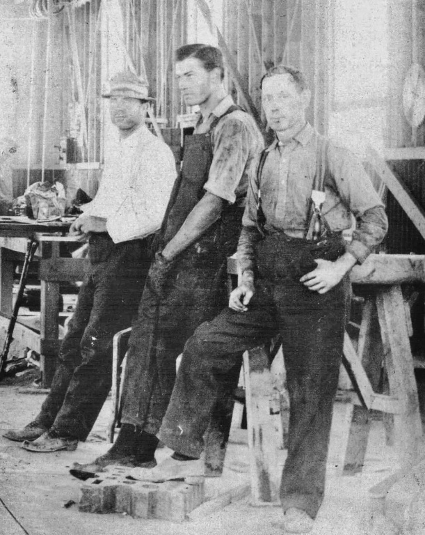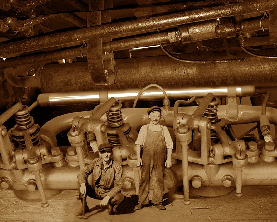 Bilford Stnotzworth and Eddie McHeadrub often stopped for the "hot soup" after their shift at the Helix Mill. Posed here maintaining the up-scaled Hoover & Kirby pumps.