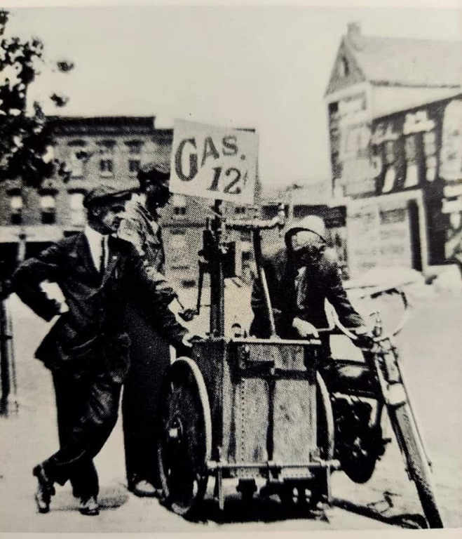 Malachi Spidroft was a well-known Tri-burg entrepreneur who purchased the first motorcycle in the Basin. Quick to apprehend the marketing possibilities in mobile service, he tried a number of for-profit schemes by providing mobile convenience to his customers. At one time or another he ran a mobile food cart and later, gasoline delivery for out-of-gas, stranded travelers. From the sign, it's difficult to tell which is the product in this photo.