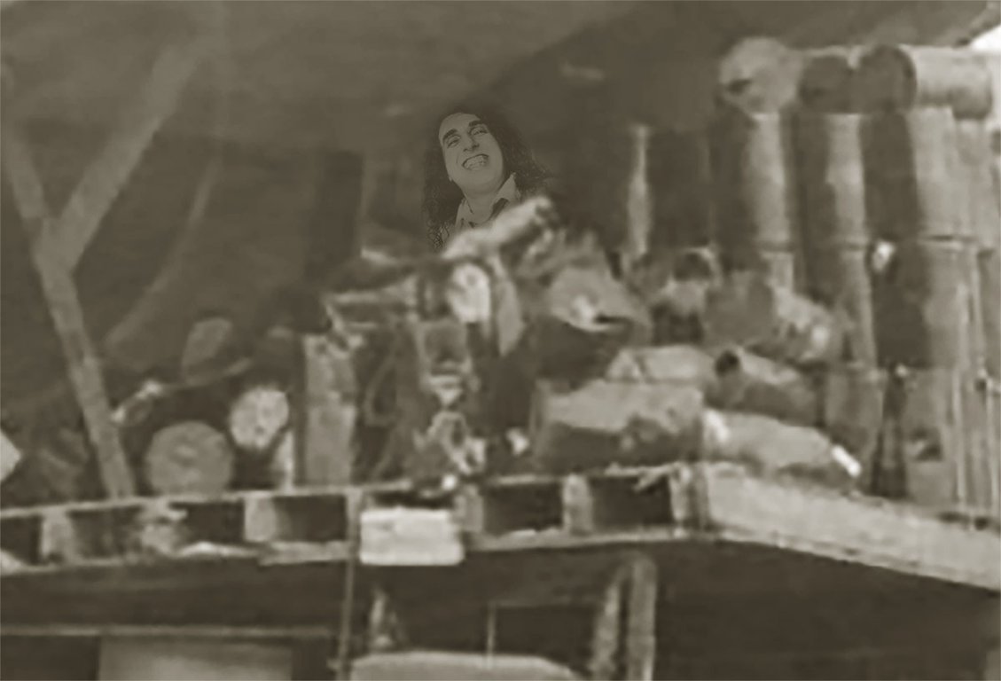 The "pirate" has been identified as Ragnar Valparaiso, maintenance foreman at the Silver Bow Skunk Works, who was on loan for the project. That's a rat-tail file in his mouth, both his hands are busy. The shop was over-run with the pesky rodents, and Ragnar was a rapid rat wrangler.