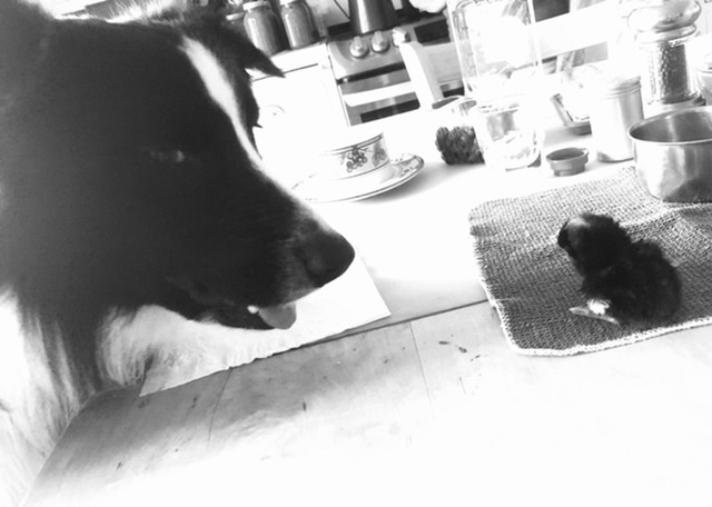Cuthbert attempted to raise domestic home-grown lips to fill the demand. Unfortunately, in the high desert environment, his stock tended to grow teeth as well, and the lips were too small and of indifferent quality to make the venture profitable. Hand-raising individual birds was laborious and time consuming. Here we see Cuthbert's sheepdog caring for a new hatchling.