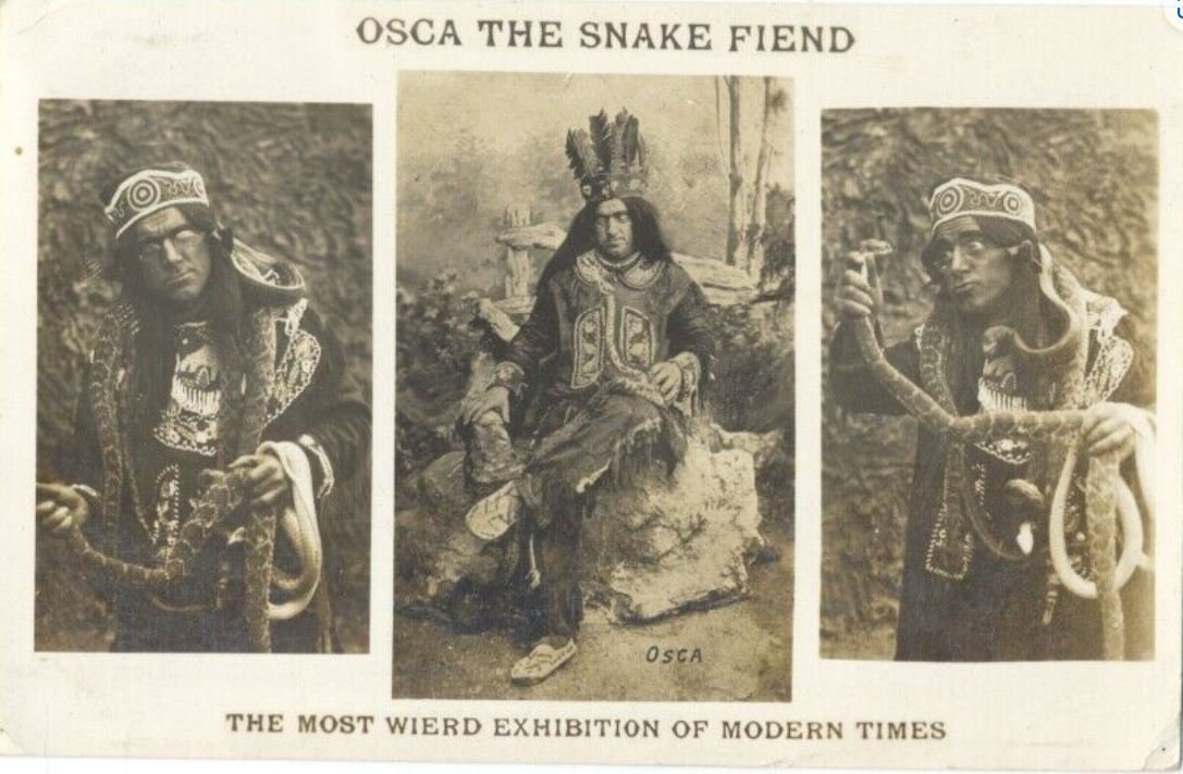Herb, thank you for providing that brochure. It's a miracle one survived, as the rest were rejected by the partners, and destroyed by the printer, Elmo Hotfinger, whose print shop featured the first Line-O-Type machine in the basin. Obviously the print job was rejected for the glaring errors Hotfinger had made setting type for the job. The header should have read "Osca the Snake Friend", and "The best wired exhibition of modern times". Here's the story: Osca Meir discovered that a rare breed of snake found only in the Basin was capable of producing an electric current when it slithered over a permanent magnet, the essence of the principle upon which the magneto operates. Pursuing this phenomenon, Osca fortuitously made the acquaintance of Humphrey Wainwright (photo below) who had been keeping the peculiar serpents as pets, and had bred a particularly biddable strain. The two formed a partnership with the intention of providing portable electric lighting for traveling tent revivals, carnivals, circuses and the like, but prospective clients found their methods shocking, and besides, the snakes never got off the "ground".
