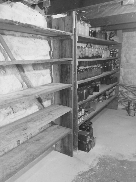 The munkberry famine hit the tri-burg area very hard. This photo from the archives shows Ma Furstenwurst's fruit cellar after she donated all the munkberry moon she had on hand to St. Swithin's Orphanage in Saddlestring. Rumor has it she held back one can of munkberry moon ( kidney bean flavor ) for Kalamity Dick when he made his monthly call. Dick had to eat the whole can of it at one sitting while hiding down in her cellar to keep the hoarders from getting it. A bronze plaque above the cellar door commemorated the event until it was turned in during the WWII scrap drives. Widgeon Schufelt provided a photo of it for the Institute's archives. Sigfreid is currently decoding it.