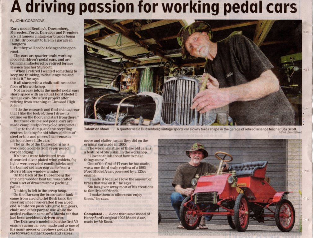 I wanted to share the following article in the local newspaper with you. Stu's work is fabulous using everything from old pianos (great wood), bean tins to teapot lids, his motto is to find junk or pay as little as possible: