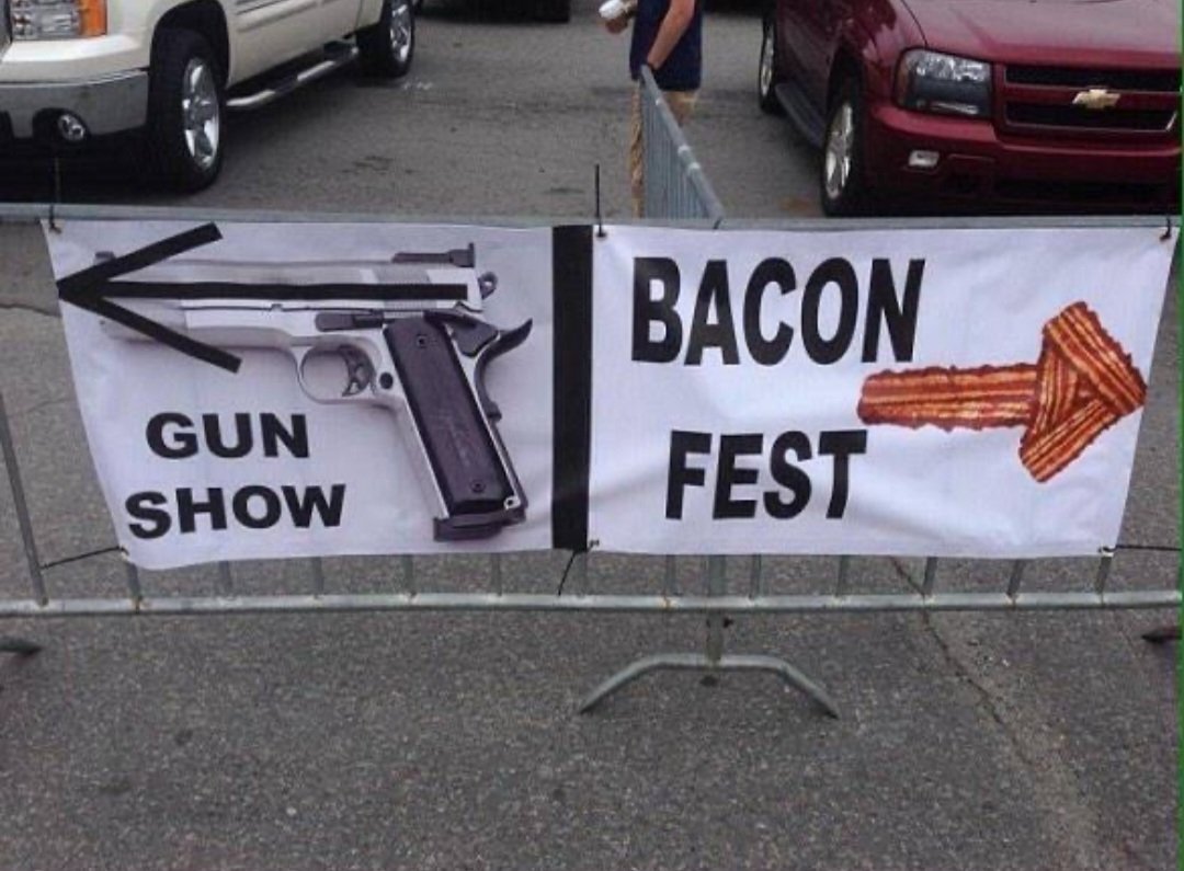 If they don't let you into the bacon fest go to the gun show then return to the bacon fest (COME ON IN SIR)