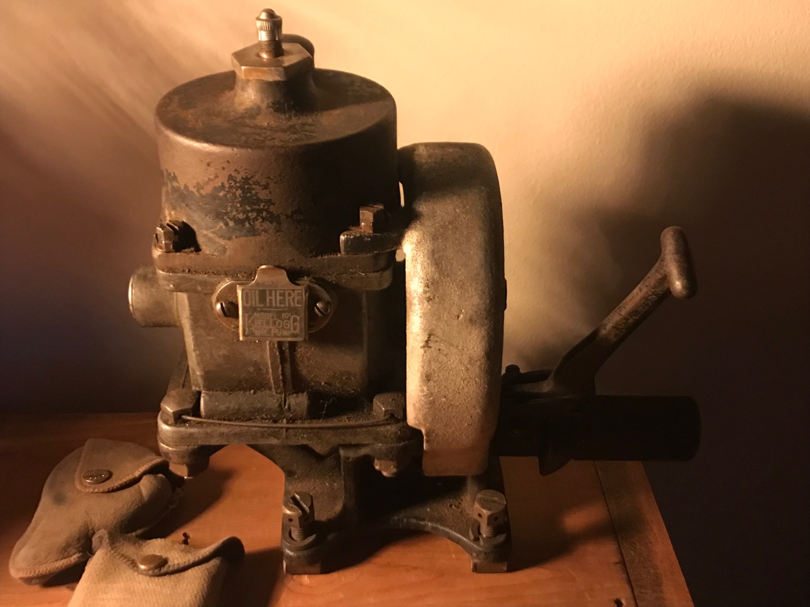From this ad "a very old Kellogg's tire pump...some were mounted on the cars themselves, others were used at old gas stations for pumping up car and bicycle tires....this model #101 was made in rochester, ny ...pat. is 1916/1918.