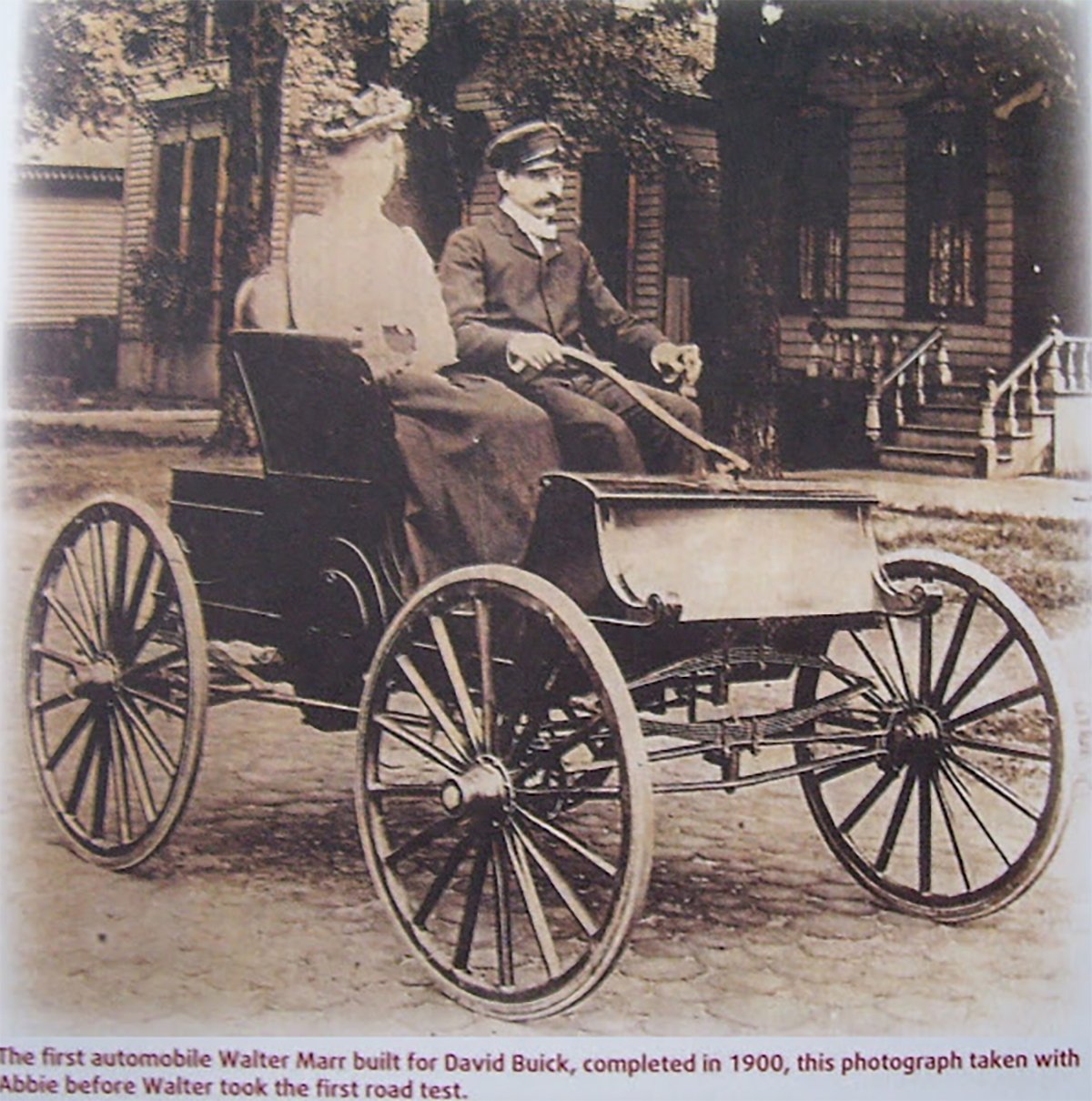 "The photo shown above is the car often credited with being the first Buick. It is the vehicle used by Walter Marr, shown behind the wheel and Thomas Buick (David's son) to make the historic trip from Flint to Detroit and back. The 2-day, 230 mile trip was made to convince apprehensive backers that the car was a substantial and functional vehicle worthy of manufacture." (July, 1904.)