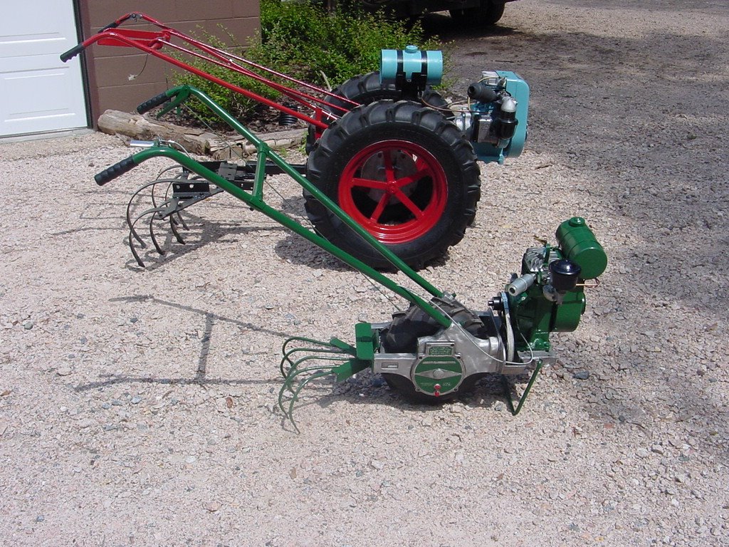 The 2 walking tractors are a Choremaster and a Page.The Page is 1948 and the Choremaster is about 1950?