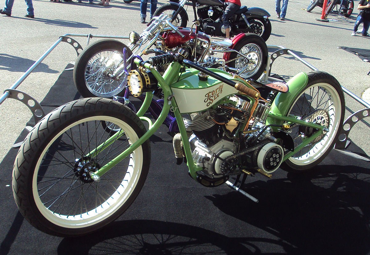 That’s a pretty crazy looking front end on the green Panhead bobber.