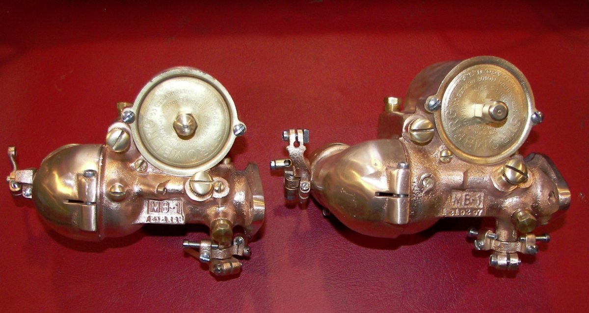 Matching or nearly matching set of Stromberg MB-1's, sold as original equipment on several overhead conversions in the mid to late 20's as they will bolt right to the head on several different models. Easy to adjust, trouble free and -- probably more important then than now -- easy to start. Some of the carbs in those days had terrible starting characteristics. These also have a separate idle circuit which a lot of carbs didn't, they relied on a compromise mixture for idle and high speed. The down side of these is they don't have an accelerating well like the OS-1 and 2, nor an economizer, but today the economizer isn't such a big deal and these run great without the well because of the long venturi and main jet design.
