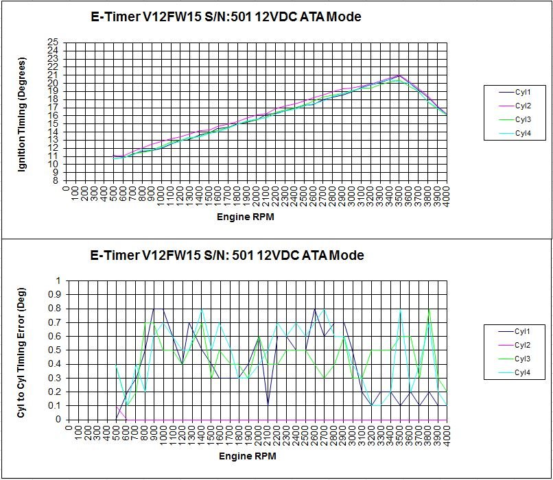 Mechanical tolerances were verified by electrical performance test using the E-Timer and its specially designed test set. Cylinder to cylinder timing error is less than +/- 0.4 degrees. Note that Automatic Timing Advance remains active and accurate from 400 RPM to 3500 RPM during this timing accuracy test operating on 12VDC battery.