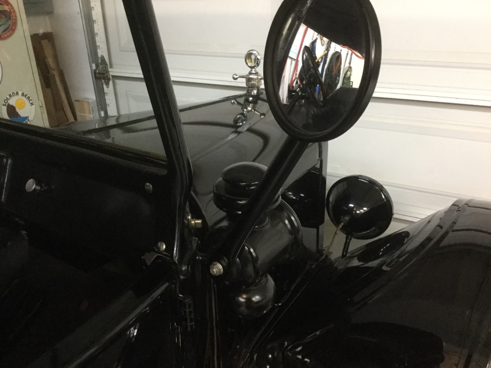 I currently have a chrome clamp on mirror for my 23 roadster, but it constantly scratches up the windshield post. I thought about getting one that screwed to the post but I'm afraid if it's bumped, it'll damage the post. I guess I could live with the clamp mirror but I can't stomach the chrome and they don't seem to make a black one. Is there a source for a black hinged type mirror that looks period correct?
