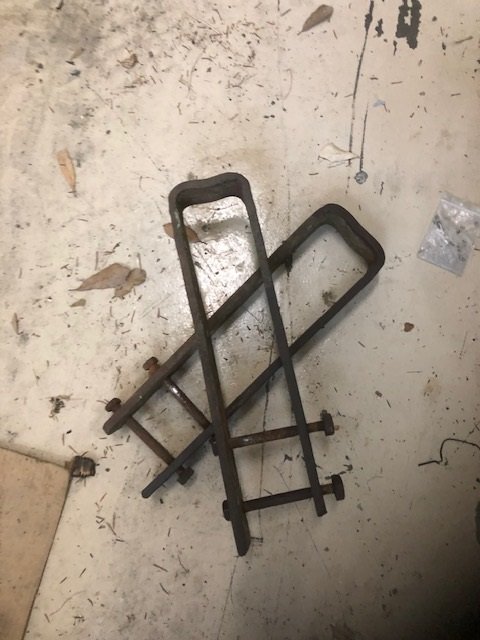 The 'horns' of the late chassis corner brackets have been amputated getting ready for early model fender hangers. The frame is upside down because it is easier to re-rivet the frame with it upside down.