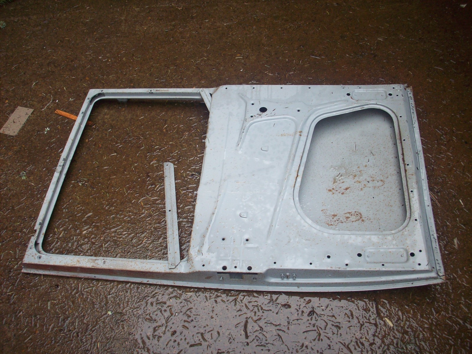 I could be totally wrong, but it looks a lot like the right hand door for a 1928 or 1929 Model A closed cab pickup.