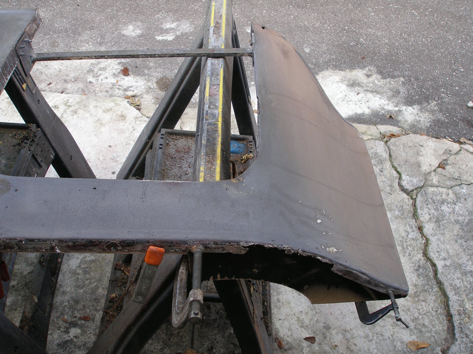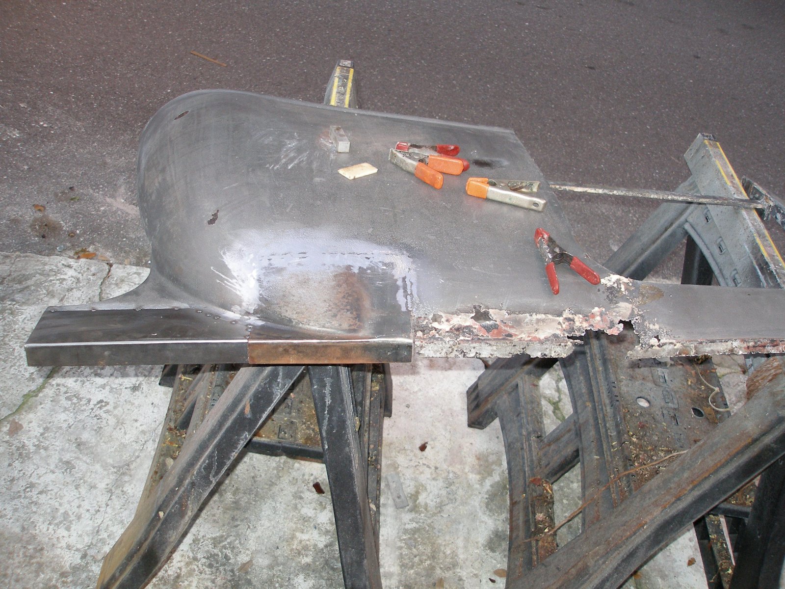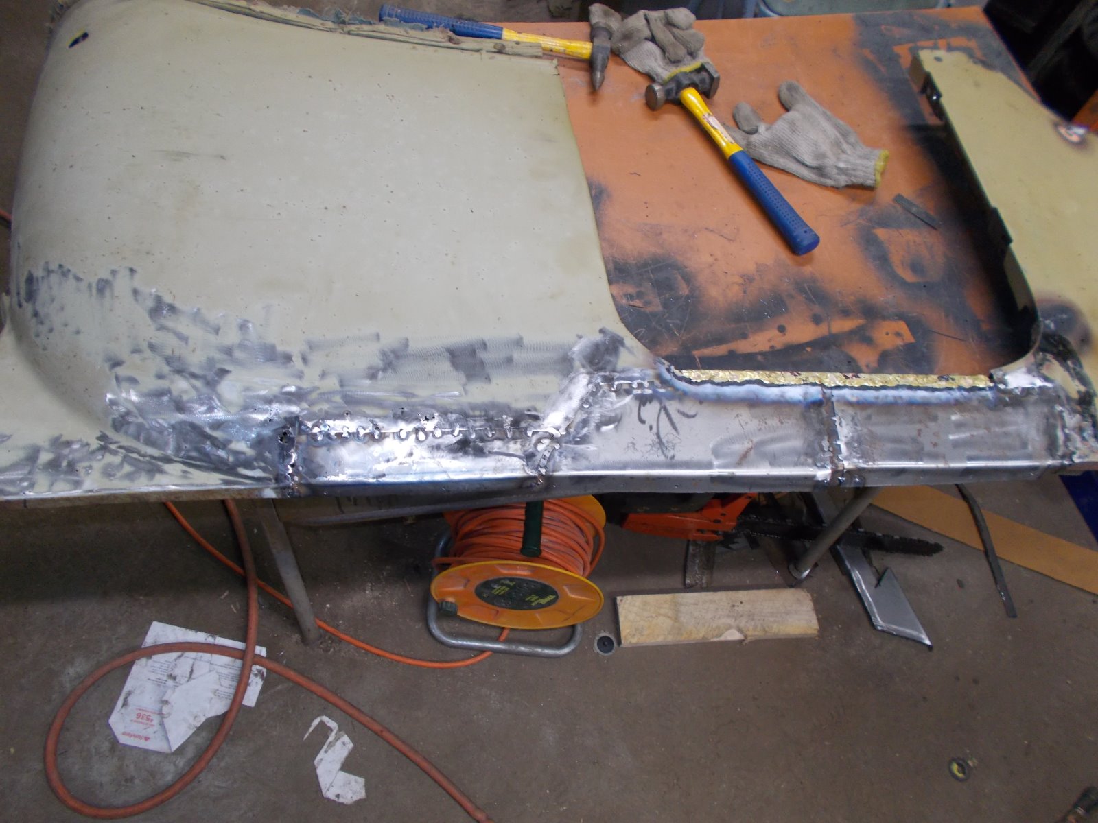 Repairing rust damage on the bottom edge of my 24 roadster body. Drivers side went good, simple strip of new tin. But the door side was a problem, Placed the panel on my bench, clamped the door in place and cut new tin to patch. Welded in place and tried it on the wood frame, not even close to fitting. Had to split the new tin and extend it by one half inch. Seems to fit good now and the door fits,