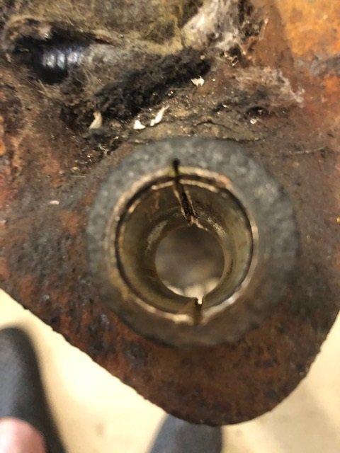 I am using the 'Shackle and Spindle Arm Bushing Driver' from Lang's https://www.modeltford.com/item/3820-44T.aspx I've cut it with a hack saw on 2 sides (see pictures) and whacked it pretty hard with a 5 pound hammer but it doesn't seem to budge. The brake drum backing plate is off. The insect larvae uncovered is a plus. I could use advice at this point because it doesn't seem to be moving. Hack saw it more? The last picture has the new bushing right beside where it is supposed to go for comparison.