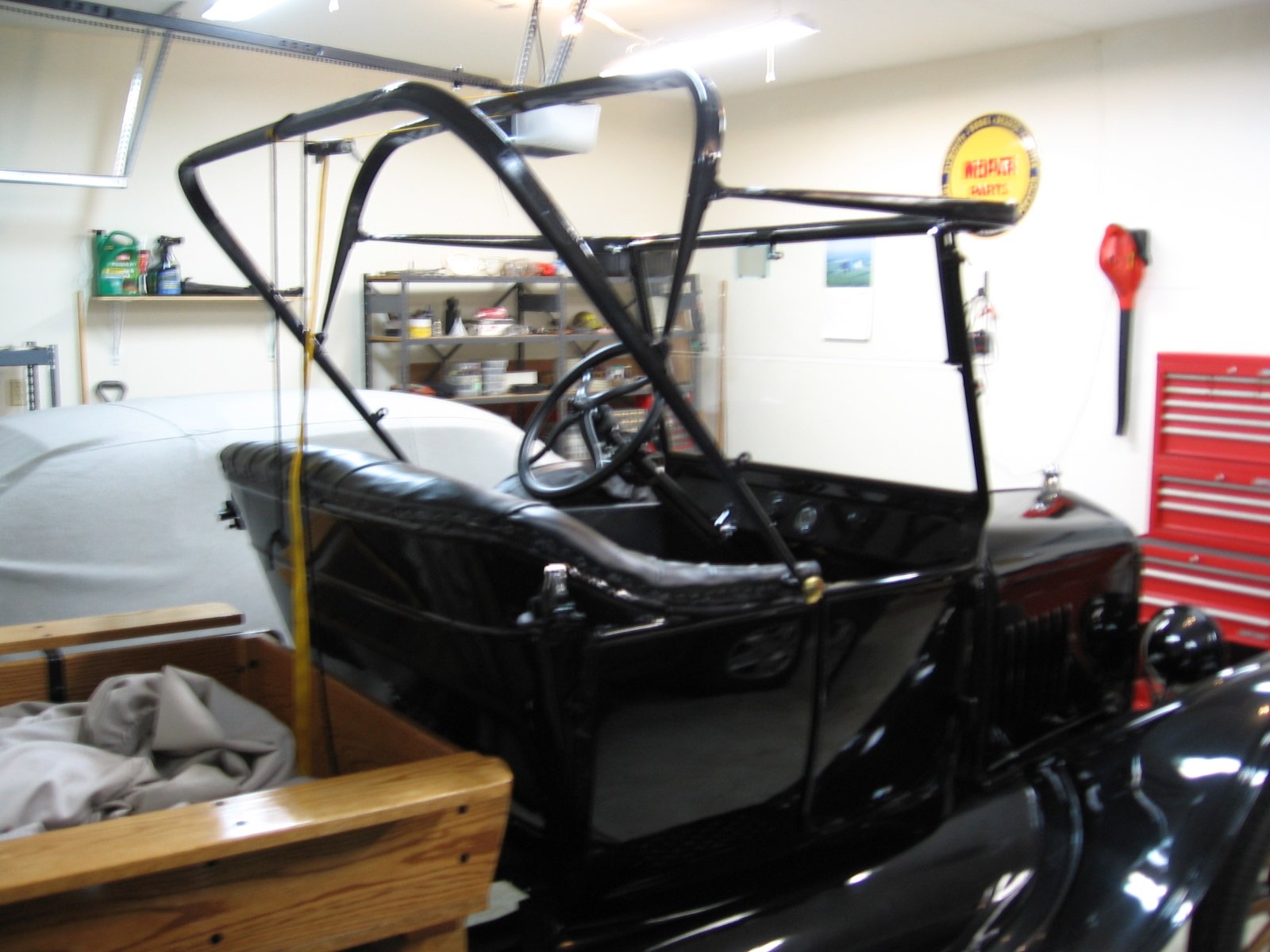 Here are some more pictures from the roadster upholstery and top installation on my 1924 cut-off touring (now a pickup). The car came to me with a Cartouche upholstery kit for a roadster, it fit the front seat of the touring just fine. If it had been up to me, I would have bought a Classtique upholstery kit for the front seat of a touring, it probably would have fit event better. One tip - buy some extra cotton batting to supplement what comes with the kit, it will allow you to add more fullness to the upholstery pleats.