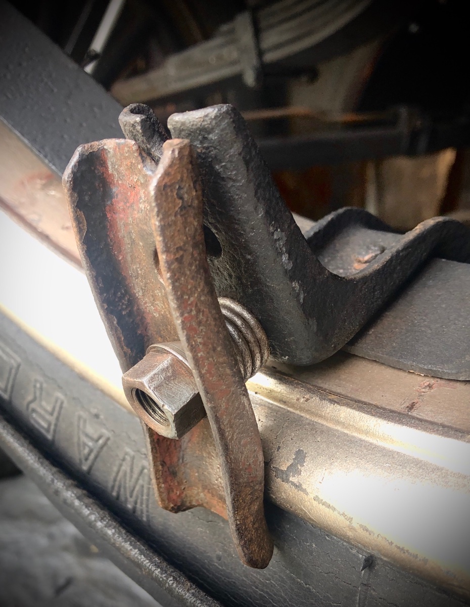 Ok .. I found that the geometry worked better with a spacer where the bolt goes through the bottom holes of the stationary and movable clamp, so I installed a cut down band spring. Works nicely. I believe the nut probably had a wide flat integral washer rather than the taper but I don’t know. Now I need to find the right size vintage padlock.