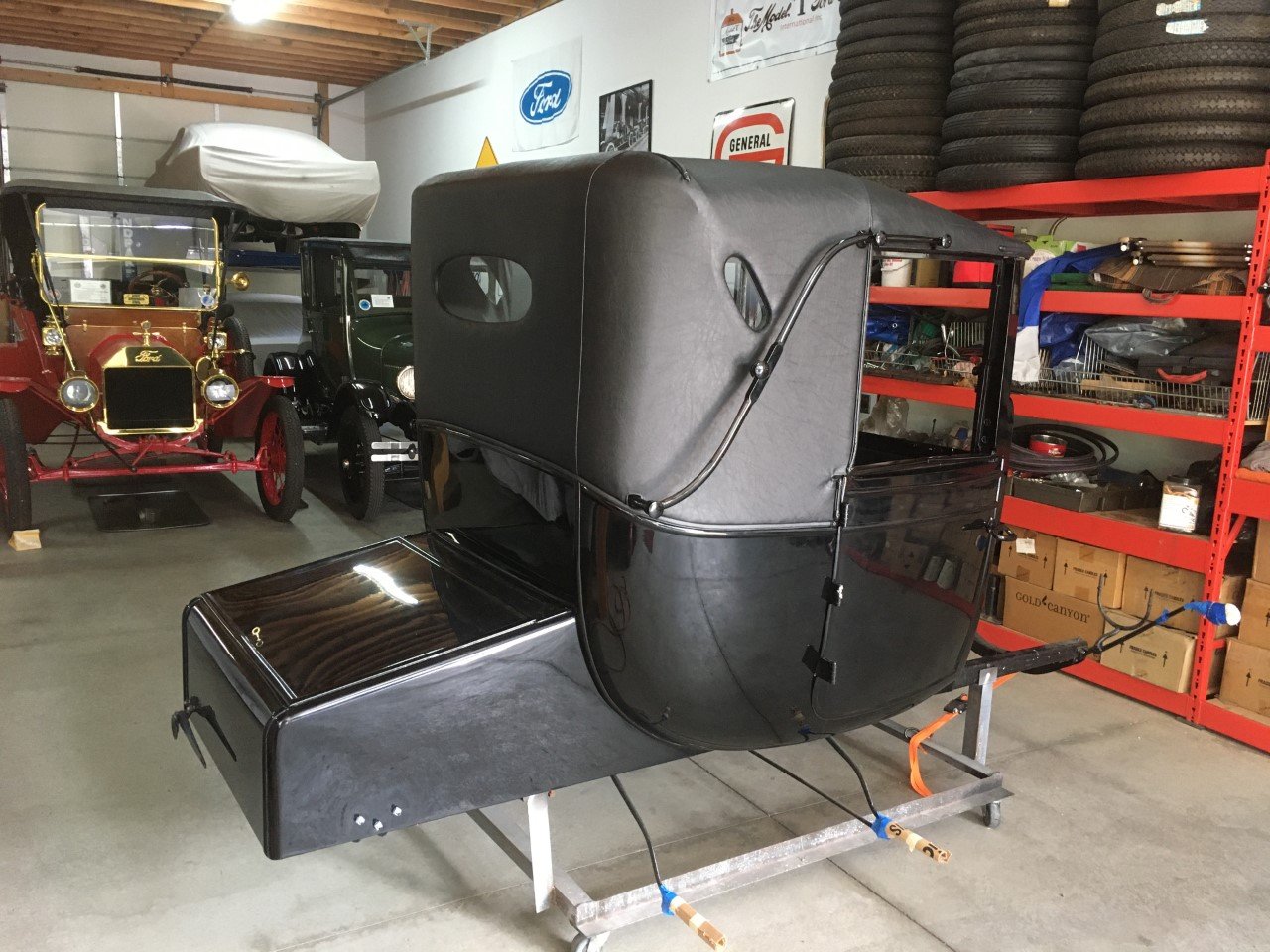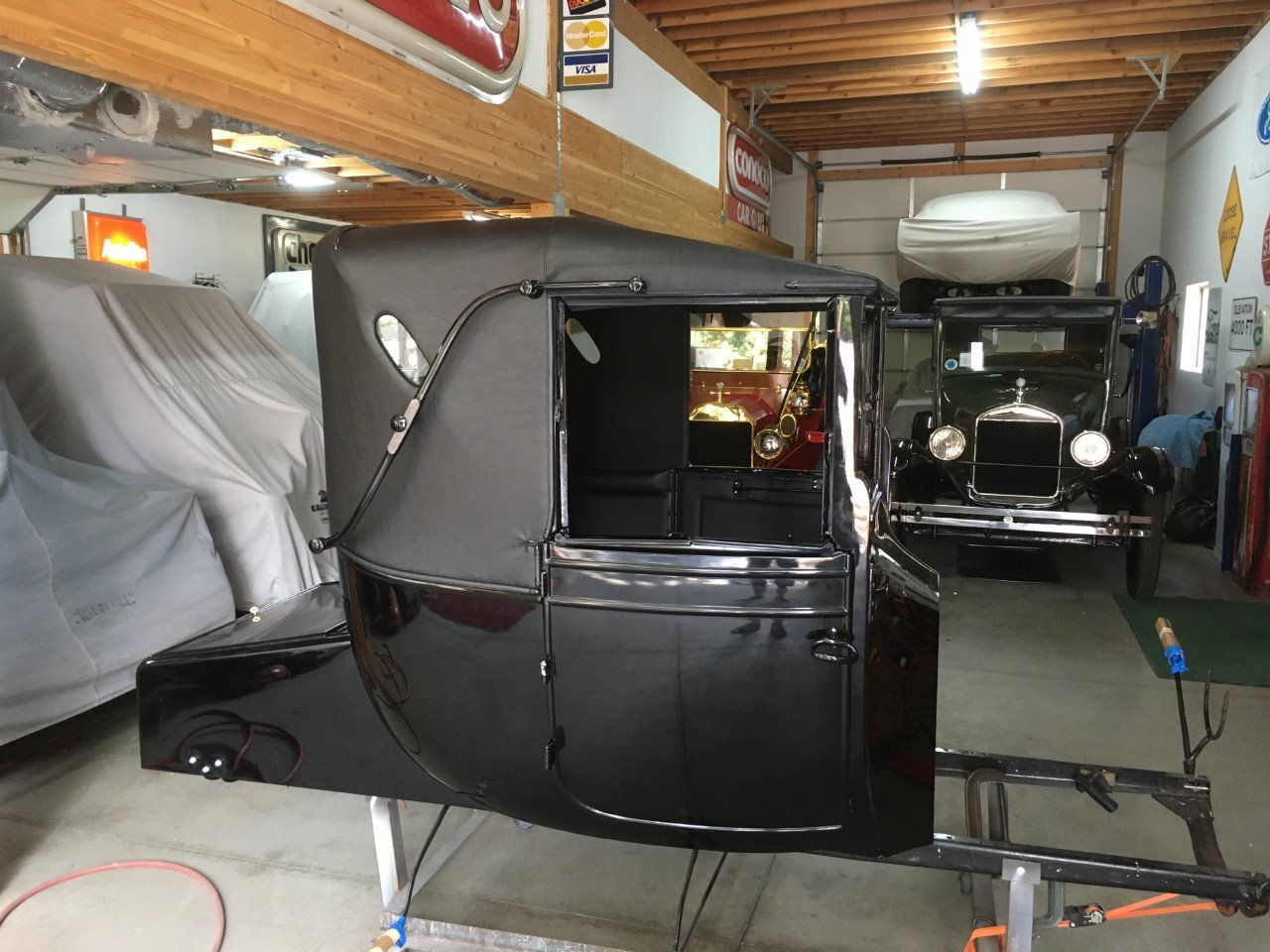 It's time to move along with another restoration, and this 1916 Coupelet is my latest project. The car was purchased by Mike Walker, who had worked on the chassis, but did not get the body completed when I purchased the car from him. I had Ray Wells re-wood the body and had my good friend massage the body panels and paint the car in Limco "Ultra Black" single stage urethane. The upholstery and top were completed by Ernie Romero of El Cajon, CA. The engine was rebuilt by Jim Blair of Tucson, AZ and I completed the assembly and restoration of the engine assembly. The engine, with a casting date of 12-27-15 and SN: 1025XXX, determine that the car was completed on December 30, 1915. Interestingly, I have an original photo of a new 1916 Coupelet at the factory with black and brass trimmed side and head lamps, and I have a set of these lamps I may use. I have completed the front and rear end rebuilds and the frame is also ready to paint. Here are a few photos of the Coupelet: