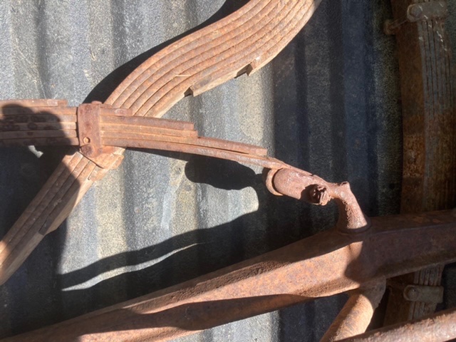 The front spring is a messed up put-together super heavy duty (I have a similar one in my pile). You would need to take it apart to see how many leaves are straight and decent enough to be used. I see some that are broken halves (must be drilled for the center bolt). There may or may not be enough good pieces to make one good spring. Otherwise, it is good parts to repair another spring. The broken halves may also be useful. The ends can be cleaned up on a good grinder to make shorter top leaves.
