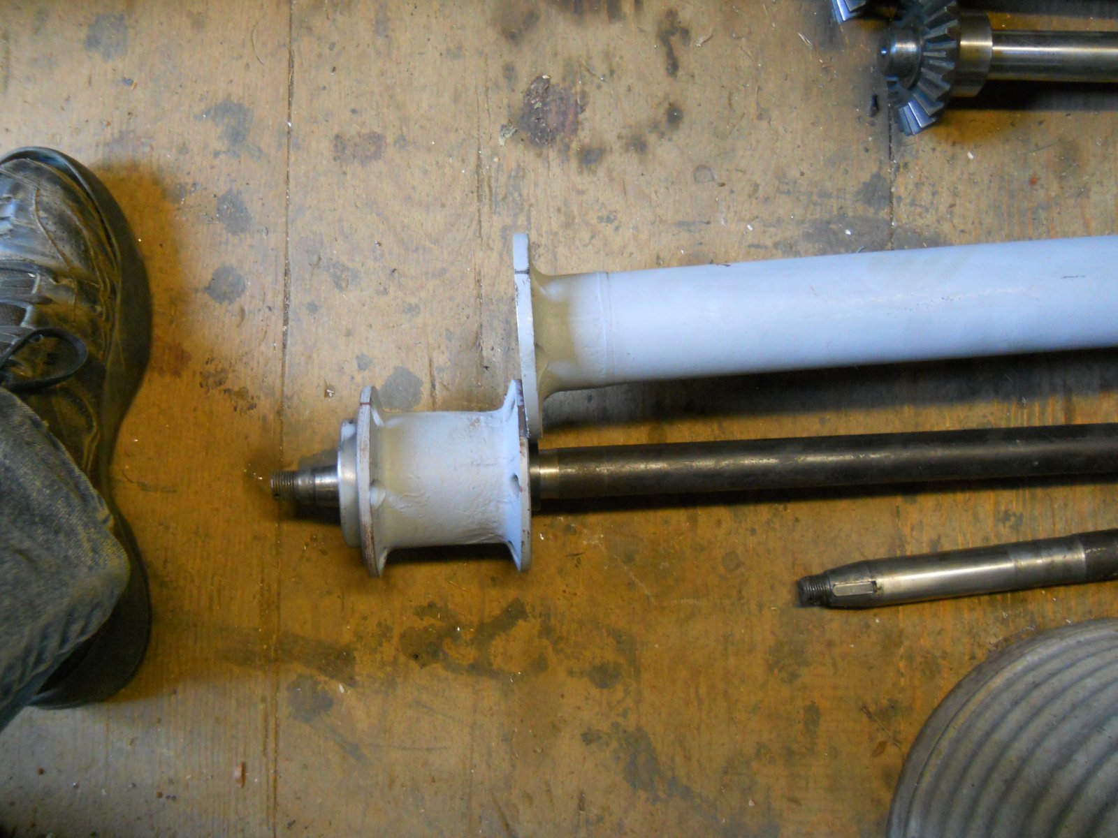 I am rebuilding a rear end that will have a Volvo overdrive installed. Great except, the person that started the project is not in the picture. Tim bought this setup that was going to be use with extended frame, but his plans are to use with 26/27 coupe body and keep stock length. As it is now it's too long. Does any one know who may have made this? I email Kevin P and he does not know. If I can't find out who then I am going to fit the housings together and hope to take some off the front and hope I can get everything to line up. This is going behind a pretty hot T engine with disk brakes and safety hubs. The bottom photo gives and idea how much needs to come off to make work as we need it.