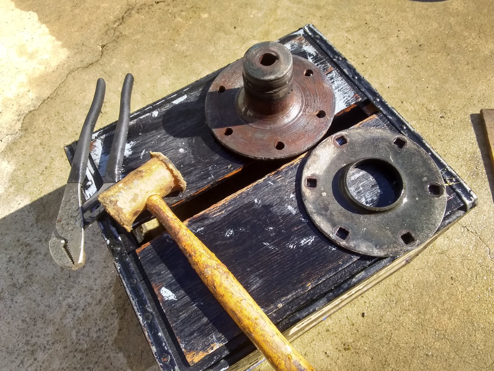 Since I don't have a blow torch, I heated the assembly in a bucket with a fire for about 20 minutes. Next a nice cool down with the hose, followed by several whacks with the mallet.