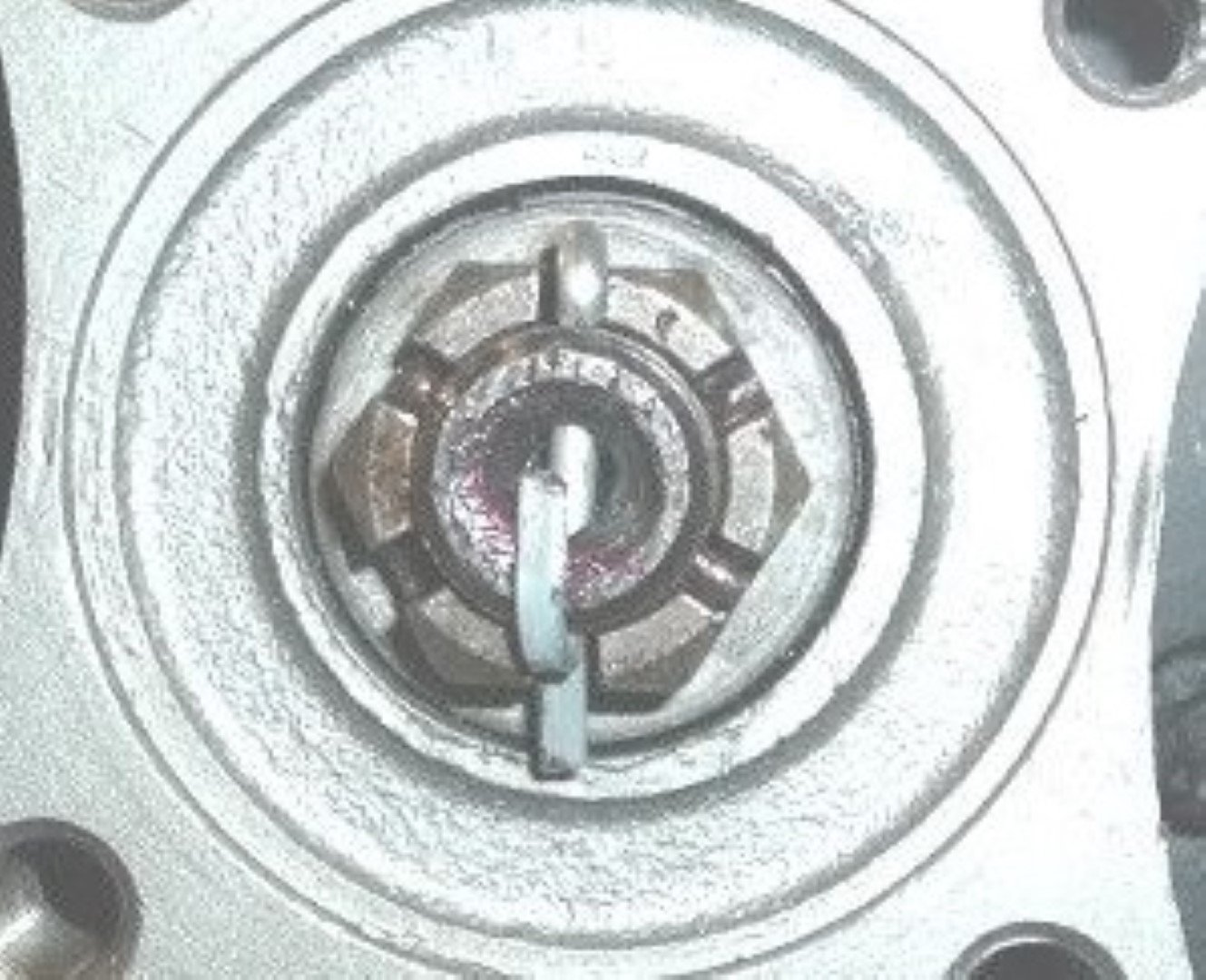 By the way, the correct way to use split (cotter) pins is with the flat sides even with the castle nut sides so that the head nestles into the gap snugly. One leg is bent up and across the bolt end, pulling the head in firmly. Cut the leg off about about the width of the bolt end, but in any case at least 1/2 way as in the picture below. The second leg is cut off even with the castle nut, but a little proud like the picture is OK too.