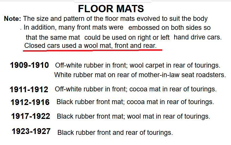 Just updated the chronology in my post above - cocoa mats from 1911 to mid 1917, wool felt to 1921 or 22, rubber afterwards, all for touring cars.