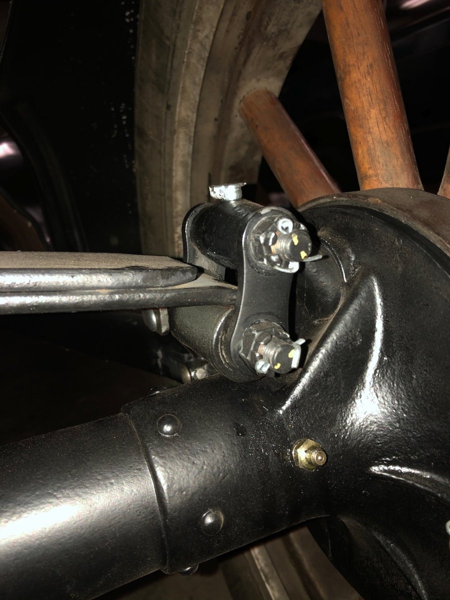 I rebuilt my 25-26-27 T's rear axle, replacing worn out shackles. Everything is back together except I can't figure out what to do about the lower oiler. I can install it by lifting the frame and dropping the axle, but then there is no way I can get oil into it without jacking up the car again. This makes me wonder if my springs are too flat? Is this the proper resting position for the shackles, with the wheels on the ground?